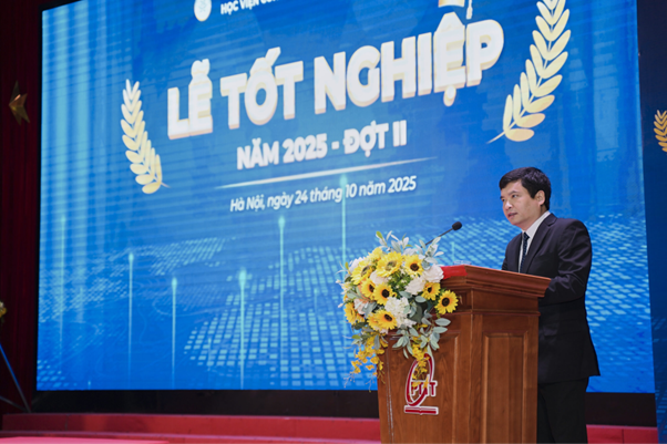 Tiếp nối những lời chúc mừng các tân thạc sĩ, tân cử nhân, PGS. TS Trần Quang Anh, Phó Giám đốc Học viện nhắn nhủ: Trong bối cảnh sự phát triển của trí tuệ nhân tạo, kinh tế số và tự động hóa đang làm biến đổi sâu sắc cơ cấu việc làm, các em: “Hãy giữ tinh thần học tập suốt đời,vì tri thức chính là hộ chiếu bước vào tương lai. Hãy dám bước ra khỏi vùng an toàn, vì mọi kỳ tích đều bắt đầu từ một bước chân dũng cảm. Hãy giữ vững giá trị nhân văn, vì công nghệ có thể thay đổi thế giới, nhưng chính con người mới quyết định thế giới đó trở nên tốt đẹp như thế nào”.