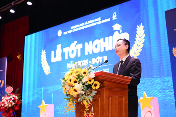 PGS.TS Trần Quang Anh, Phó Giám đốc Học viện chúc mừng ghi nhận những nỗ lực của các Tân Cử nhân trong quá trình học tập tại Học viện. Ảnh: Học viện Công nghệ Bưu chính Viễn thông