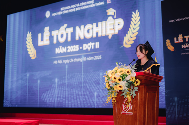 Đại diện các tân cử nhân khối ngành Kinh tế vừa nhận bằng tốt nghiệp, Đinh Thị Diễm Quỳnh – Thủ khoa ngành Truyền thông Đa phương tiện xúc động chia sẻ: Được học tập dưới mái trường Học viện Công nghệ Bưu chính Viễn thông là niềm may mắn và tự hào lớn của chúng em. Tại đây, chúng em không chỉ tiếp cận tri thức tiên tiến về công nghệ và truyền thông mà còn được sống trong một môi trường đổi mới, nơi mỗi sinh viên đều được khuyến khích bứt phá giới hạn để tạo ra giá trị cho xã hội trong kỷ nguyên số.